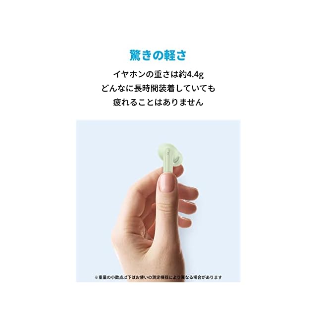 Soundcore | Hear It. Feel It.<br> 心地良く、等身大に音楽を楽しみたいあなたへ贈る、Ankerのオーディオブランド<br><br>製品の仕様<br> 再生可能時間:最大8時間(イヤホン本体のみ) / 最大32時間(充電ケース使用時)<br> 充電端子:USB Type-C<br> 重さ:約47g(充電ケース含む) / 約4.4g(イヤホン本体 片耳)<br> 防水規格:IPX5<br> 通信方式:Bluetooth 5.2<br> Bluetoothプロファイル:A2DP, AVRCP, HFP, HSP<br> 対応コーデック:SBC / AAC<br><br>注意<br><br>・本製品はSoundcoreアプリ非対応です。<br>・お使いの機器とイヤホンを接続する前に、必ずイヤホンのシールを剥がしてからケースに戻して電源を入れてください。<br>・片耳使用時はイコライザー設定は切り替えできません。<br><br>パワフルなサウンド<br>3層構造の大型の10mmドライバーを搭載。コンパクトな小型モデルながら、迫力ある低音を実現します。<br><br>好みのチューニングが選べる<br>バランスの取れた通常モードに加え、低音を増幅させた低音モード、音声をクリアに強調するボーカルモードの3つのイコライザーモードからお好みに合わせてお選びいただけます。<br>※イコライザー設定は、イヤホン本体(右耳)を3回タップして切り替え可能です。<br><br>軽くコンパクトなサイズ感<br>イヤホンの重さは約4.4g。どんなに長時間装着していても疲れることはありません。ケースもコンパクトなサイズで小さなポケットやカバンの中にもすっきりと収まります。<br><br>最大32時間の長時間再生<br>イヤホン本体が満充電の状態で、最大8時間の音楽再生が可能です。また付属の充電ケースを合わせて使えば、最大32時間の連続再生が可能です。また10分間の充電で約1時間の音楽再生が可能です。<br>※再生可能時間は、音量、再生する内容、使用環境によって異なります。<br><br>クリアな音声通話<br>AIノイズリダクション搭載。AIがあなたの音声と周辺のノイズを認識し、ノイズを除去しながら人の声を大きく伝送することで、通話相手はあなたの音声をよりクリアに聞くことが可能です。<br>※この機能は通話時のノイズを除去する機能であり、音楽を聴くときに周囲の雑音を除去するものではありません。<br><br>片耳でもお楽しみいただけます<br>左右のイヤホンの単独使用と両耳での使用を簡単に切り替えることができます。<br>※片耳使用時は、もう片方のイヤホンを充電ケースに戻し、ケースの蓋を閉じてください。<br>※片耳使用時は、イコライザー設定は切り替えできません。<br><br>1ステップで簡単接続<br>充電ケースを開けると自動的にペアリングモードになり、簡単に接続できます。<br><br>安定した接続<br>Bluetooth 5.2に対応し、音飛びを極限まで抑え、安定した接続で音楽をお楽しみいただけます。