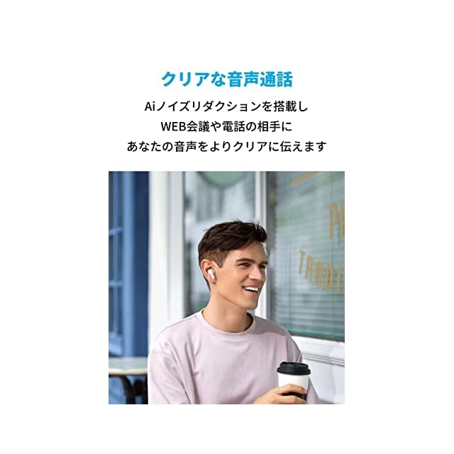Soundcore | Hear It. Feel It.<br> 心地良く、等身大に音楽を楽しみたいあなたへ贈る、Ankerのオーディオブランド<br><br>製品の仕様<br> 再生可能時間:最大8時間(イヤホン本体のみ) / 最大32時間(充電ケース使用時)<br> 充電端子:USB Type-C<br> 重さ:約47g(充電ケース含む) / 約4.4g(イヤホン本体 片耳)<br> 防水規格:IPX5<br> 通信方式:Bluetooth 5.2<br> Bluetoothプロファイル:A2DP, AVRCP, HFP, HSP<br> 対応コーデック:SBC / AAC<br><br>注意<br><br>・本製品はSoundcoreアプリ非対応です。<br>・お使いの機器とイヤホンを接続する前に、必ずイヤホンのシールを剥がしてからケースに戻して電源を入れてください。<br>・片耳使用時はイコライザー設定は切り替えできません。<br><br>パワフルなサウンド<br>3層構造の大型の10mmドライバーを搭載。コンパクトな小型モデルながら、迫力ある低音を実現します。<br><br>好みのチューニングが選べる<br>バランスの取れた通常モードに加え、低音を増幅させた低音モード、音声をクリアに強調するボーカルモードの3つのイコライザーモードからお好みに合わせてお選びいただけます。<br>※イコライザー設定は、イヤホン本体(右耳)を3回タップして切り替え可能です。<br><br>軽くコンパクトなサイズ感<br>イヤホンの重さは約4.4g。どんなに長時間装着していても疲れることはありません。ケースもコンパクトなサイズで小さなポケットやカバンの中にもすっきりと収まります。<br><br>最大32時間の長時間再生<br>イヤホン本体が満充電の状態で、最大8時間の音楽再生が可能です。また付属の充電ケースを合わせて使えば、最大32時間の連続再生が可能です。また10分間の充電で約1時間の音楽再生が可能です。<br>※再生可能時間は、音量、再生する内容、使用環境によって異なります。<br><br>クリアな音声通話<br>AIノイズリダクション搭載。AIがあなたの音声と周辺のノイズを認識し、ノイズを除去しながら人の声を大きく伝送することで、通話相手はあなたの音声をよりクリアに聞くことが可能です。<br>※この機能は通話時のノイズを除去する機能であり、音楽を聴くときに周囲の雑音を除去するものではありません。<br><br>片耳でもお楽しみいただけます<br>左右のイヤホンの単独使用と両耳での使用を簡単に切り替えることができます。<br>※片耳使用時は、もう片方のイヤホンを充電ケースに戻し、ケースの蓋を閉じてください。<br>※片耳使用時は、イコライザー設定は切り替えできません。<br><br>1ステップで簡単接続<br>充電ケースを開けると自動的にペアリングモードになり、簡単に接続できます。<br><br>安定した接続<br>Bluetooth 5.2に対応し、音飛びを極限まで抑え、安定した接続で音楽をお楽しみいただけます。]