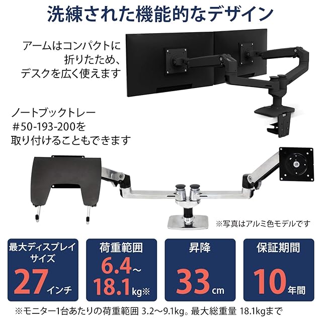 商品名:ERGOTRON エルゴトロン LX モニターアーム デスクマウント デュアル 横型 2画面 マットブラック 27インチ(6.4~18.1kg)まで VESA規格対応 45-245-224