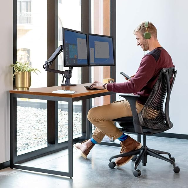 横並び配列のデュアルモニター環境にぴったりなモニターアームです。使用しないときはコンパクトに折りたため、作業スペースを広く使えます。