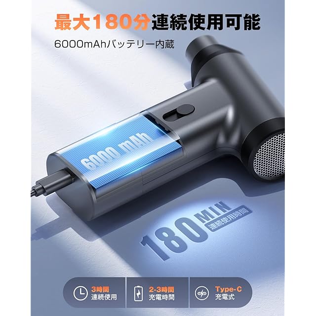 ⭕【風速120m/s、250000RPMの超高速ブラシレスモーター搭載】最新のブラシレスモーター技術を採用し、風速120m/s、最大回転数250000RPMを実現。強力な風量で、落ち葉や砂ぼこり、水、雪などを一瞬で吹き飛ばします。細かい隙間に残った砂や水も、ホウキでは難しい部分まで徹底的にクリーンアップ。室内や玄関タイル、窓サッシなどの清掃に最適です。 ⭕【無段階風量調整】風量は利用シーンに合わせてお好みの強さに調整出来る無段階調整タイプです。使用方法:スライダーを押して風量の微調整(無段階調整)ができます。*ご注意:スライダーを一番下に押し寄せると本体が待機状態に入ります。待機状態で、5分間操作が行わないと自動的に電源オフになります。 ⭕【3種類のノズル&使いやすさ】3種類のノズル:細口ノズル1本、ブラシ付きノズル1本、太口ノズル1本。電動エアダスターには、キーボードの隙間、PC周り、卓上、エアコン、火を起こす道具、車内、窓のサッシ、掃除機のフィルター、浮き輪の空気入れ、洗車後の乾燥など、あらゆる場所で使用可能です。 ⭕【省エネ設計&エアダスター缶の代替品】エアダスターは6000mAhの容量バッテリーを内蔵しており、外部電源なしで動作します。充電時間は3時間以内で、最小風力条件下では最大3時間の使用が可能です。エアダスターは、従来の使い捨てのスプレー缶に比べ、安全で繰り返し使用でき、ガス臭や空き缶処分などの心配もありません。 ⭕【コンパクト&持ち運びやすい】エアダスターのサイズは140×105×36mm、重量はわずか215gで、手のひらサイズのため片手でも持ちやすいです。また、収納に便利な収納ボックスが付属しています。このエアダスターはコンパクトなデザインで軽量なため、持ち運びやすく、家庭内のPC掃除や、外出先の洗車にも、掃除機を使うのにも最適です。 ⭕【安心のアフターサポート&パッケージ内容】メーカーが付いておりますので、ご使用中に何か疑問がございましたら、期間内に取扱説明書記載の連絡先までお気軽にご連絡ください。お客様のニーズに対応し、24時間以内にご返答いたします。 パッケージ内容:エアダスター本体*1、細口ノズル*1、ブラシ付きノズル*1、太口ノズル*1、充電用USB Type-Cケーブル*1、収納ボックス*1、日本語取扱説明書(書付き)*1