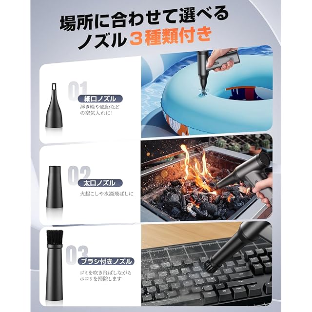 ⭕【3種類のノズル&使いやすさ】3種類のノズル:細口ノズル1本、ブラシ付きノズル1本、太口ノズル1本。電動エアダスターには、キーボードの隙間、PC周り、卓上、エアコン、火を起こす道具、車内、窓のサッシ、掃除機のフィルター、浮き輪の空気入れ、洗車後の乾燥など、あらゆる場所で使用可能です。【ご注意】充電中の使用は、感電・火災・故障の重大な危険があります。安全のため、充電が完了してからご使用ください。