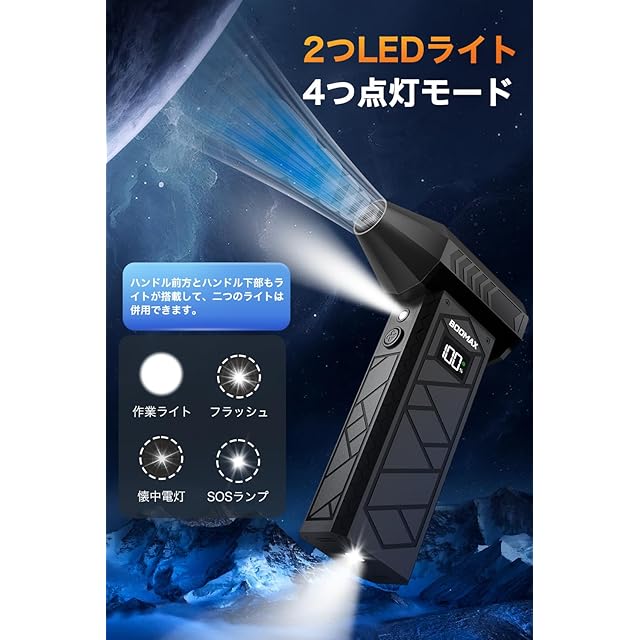 商品名:【101m/sを超える圧倒的な風速】Boomax エアダスター 電動エアダスター ブロワー 200,000RPM高速回転 4段階風量調整 20,000mAh大容量バッテリー 2つライト コードレス Type-C充電式 小型で強力 軽量 過熱保護 ノズル付き 収納カバン付き 清潔ブラシ9枚 日本語取扱説明書付き 多用途(PC 掃除/キーボード/車内/エアコン/洗車用等) ブラック 1台入り