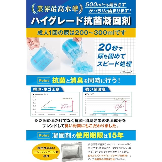 【重要なお知らせ】本製品の凝固剤は、製造日から15年以上の保存が可能です。そのため、お手元に届いた時点で、製造日からの経過により使用期限が15年未満と表示されている場合がございますが、ご安心ください。実際には15年以上のご使用が可能です。