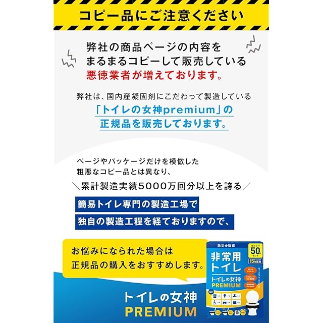 ✅【簡易トイレといえば、やっぱり "トイレの女神PREMIUM" 】トイレの女神PREMIUMは、国内の数々のアワードを受賞し、日本企業開発の徹底した品質管理で、もしもの時にも安心で使いやすいコストパフォーマンスの良い商品をお届する防災ブランドです。日本の福岡県で製造した凝固剤は、防災士監修のもと改良を重ね、強力な消臭・抗菌効果を実現しました。