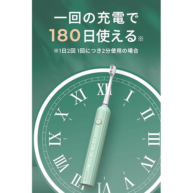 確かなブラッシング力で汚れをうかせて歯石の付着を防ぎ、大手メーカーも落とせなかった奥歯や歯間の歯垢をやわらか毛先でかき出します!電動歯ブラシのフォルムは、古典建築の代表の1つであるギリシャの宮殿の柱にインスパイアされ設計しました。洗練されたフォルムにはさらに12つのカラーバリエーションをご用意しています。 大容量2200mAhバッテリー搭載、4時間の急速充電、1回の充電で180日間(半年)使用可能です。 1年間に2回充電するだけという驚異のバッテリー持ちです。✦ 汎用性の高いUSB Type-C充電ポートであるため、携帯電話やPCのType-C充電器を使用して電動歯ブラシを充電することもできます。バッテリーが切れそうな時には、充電リマインダー機能でお知らせいたします。✦ メモリー機能が付き、選択したモードはLEDインジケーターで表示され、前回使用したモードを記憶して、次回もそのモードからスタートすることができます、 デュポン社製毛材の極細毛ブラシを採用して、毛先が歯周ポケットに入り込みます。『ハイテク磁気浮上式モーター』を搭載し、高速音波振動と振幅でしっかり歯垢をかき出します。さらに均一な振動で発生させる音波水流で歯間や歯ぐきの汚れをやさしく落とします。✦ 低ノイズ設計:最大でもわずか55dBの静音設計となっており、夜間での使用や音に敏感な方にも優しいです。✦ IPX7(浸水に対する保護等級):シャワー中に使用できるの防水性能を備えており、お風呂でも安心してご使用可 音波式歯ブラシは、細かな振動を加えることで手磨きでは難しい所まで清掃することができます。4段階の切替モードで振動速度を変えることができ、歯のダメージが心配な方でも安心してご使用いただけます。①クリーニングモード:歯垢を除去しキレイな歯に。②センシティブモード:歯と歯ぐきに優しい柔らかな振動。③ホワイトモード:ステイン(着色汚れ)を浮かせるのに最適。④ポリッシングモード:歯の表面をツルツルに。四つのブラッシングモードを搭載しており、ケアしたい内容や好みに合わせて選択できます いつまで磨けばよいのかわからない、そんな不安を解消するため、弊社の電動歯ブラシは専門家が推奨する「2分間」で自動停止します(ホワイトモードは2分30秒で自動停止します)。また、使用時30秒ごとに0.5秒の停止設定があり、口腔内の上下と表裏4箇所を均等にブラッシングできるようお知らせ機能搭載 専用替えブラシを2本付属しているため、手磨きでは届きにくい箇所のブラッシング効果もさらに期待できます。振動によって短時間で効率的にプラークを除去できるため、仕事等で忙しい方にも愛用されています。海外・国内問わず使用可能です。自分へのご褒美、彼氏、彼女や奥様、母、父、子供、友人など、老若男女問わず喜ばれるギフトです。また、誕生日 プレゼント、ホワイトデー、結婚式、記念日、いい夫婦の日、卒業祝い、入学祝い、退職祝い、転勤、送別会、母の日、父の日、バレンタインデー、クリスマス、新年やそのお返しなど特別な日の贈り物にもぴったりです。手磨きでは実現できないツルツル感を実感してください 電動歯ブラシですっきり、ツルツルな歯を実感、そして健康な歯へ。