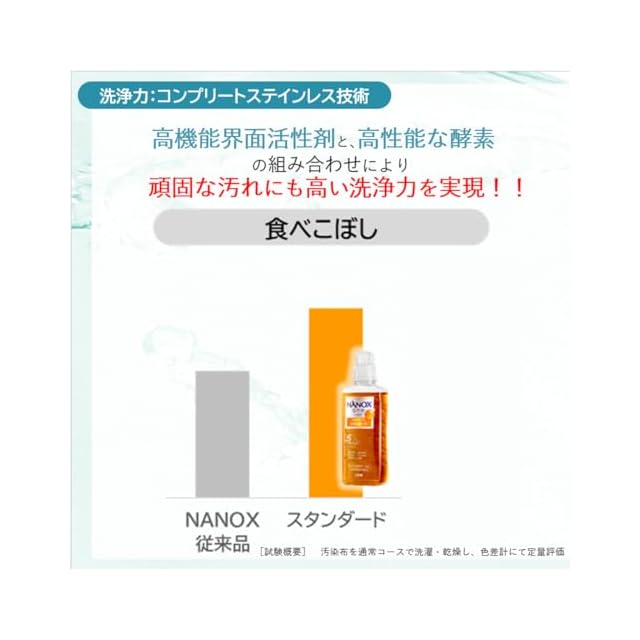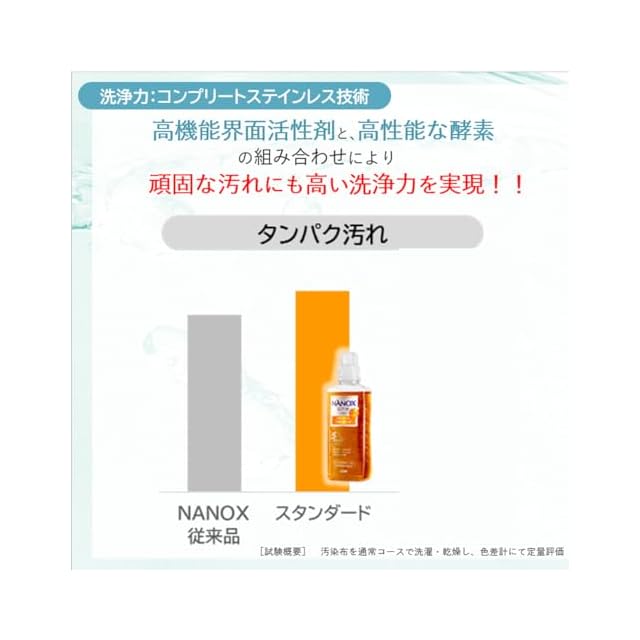 原材料: 界面活性剤(53% ポリオキシエチレンアルキルエーテル、直鎖アルキルベンゼンスルホン酸塩、アルキルエーテル硫酸エステル塩)、安定化剤、pH調整剤、再汚染防止剤、酵素