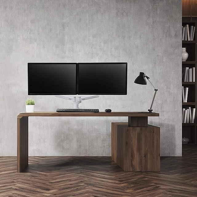 横並び配列のデュアルモニター環境にぴったりなモニターアームです。使用しないときはコンパクトに折りたため、作業スペースを広く使えます。