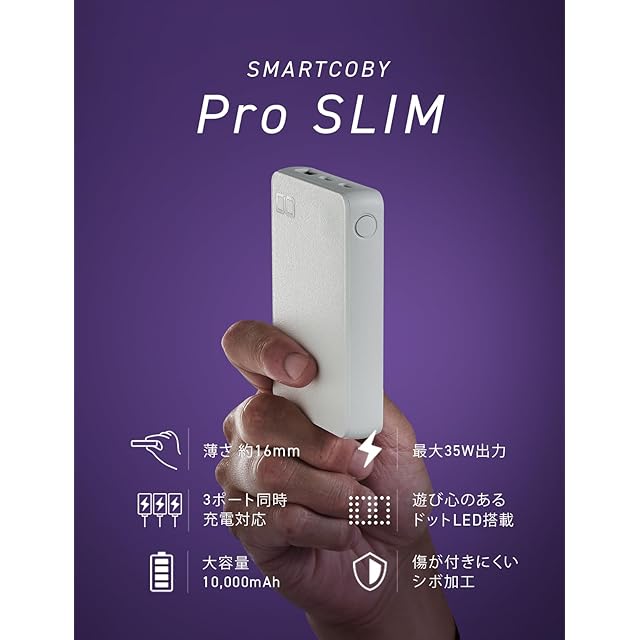 【3ポート搭載】平らなフォルムを最大限活かすため、USB-Cポート×2、USB-Aポート×1の合計3つの充電口を搭載。 様々な用途の充電が可能となり、充電しながらiPhoneやAndroid等のCポートが必要なデバイスを充電したり、 イヤホン等のAポートが必要なデバイスを充電したりと、お持ちのデバイスやケーブル状況にあわせたパススルー充電が可能となります。【急速充電】 更に『SMARTCOBY Pro SLIM』はPPSにも対応している為、 Galaxyは超急速充電モードで充電可能です。 本体は35Wに対応しており、急速充電器を用いる事で約90分で満充電に。