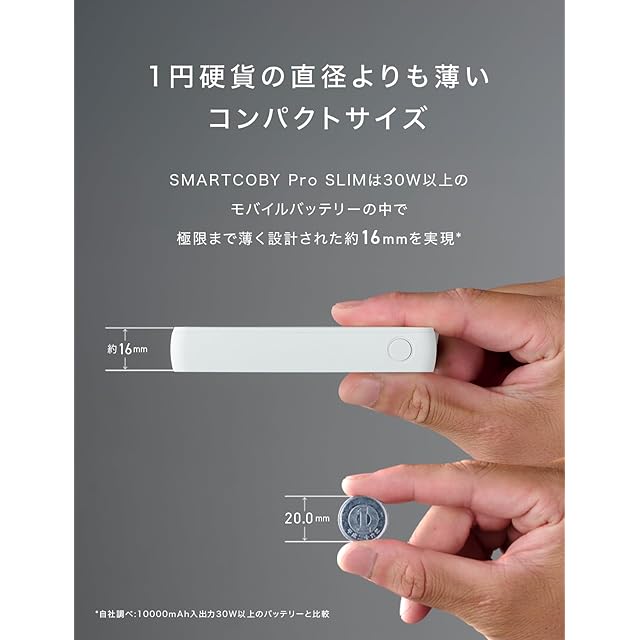 【薄さ16mm】30W以上のモバイルバッテリーの中で極限まで薄く設計された約16mmを実現。*自社調べ:10000mAh入出力30W以上のバッテリーと比較。 1円玉の直径よりも薄いサイズでどこでも持ち運びに大活躍。バッグやポーチのポケットなど狭いスペースにも楽々収納可能です。カフェや新幹線、飛行機、出張や旅行にも最適です。