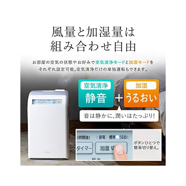 風量と加湿量は組み合わせ自由。お部屋の空気の状況やお好みで、空気清浄モードと加湿モードをそれぞれ設定可能。空気清浄だけの単独運転も可能です。