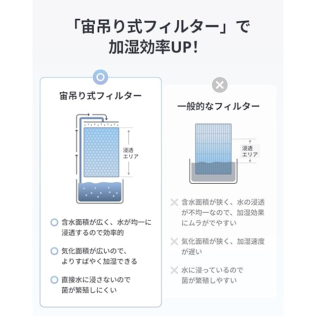 【7つの抗菌技術で清潔なうるおいをキープ】気化式のため、水の粒子が非常に小さく、菌の拡散を防ぎます。抗菌加工素材とAg+抗菌加工により、菌の繁殖と長時間の残存を抑えます。そして、外部からのほこりや異物の混入を防止する空気フィルターや、直接水に浸からず菌やカビが繁殖しにくい宙吊り式フィルターを採用しています。さらに、フィルター自動乾燥技術でカビの繁殖を防止します。これらの優れた抗菌技術により、空気が「キレイ」にうるおう環境を実現します。