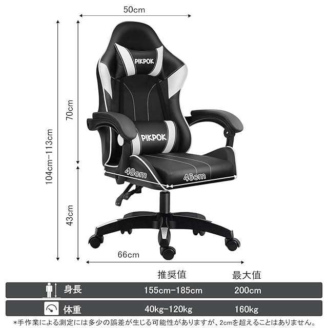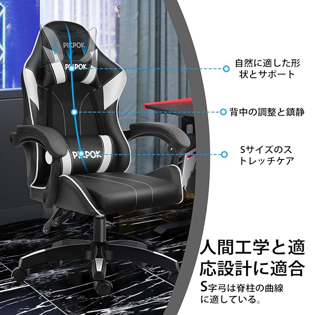 商品名:PikPok ゲーミングチェア pcチェア 椅子 デスクチェア ゲーム用チェア リクライニング パソコン ハイバック ヘッドレスト ランバーサポート ひじ掛け付き 高さ調整機能 PUレザー (黒と白)