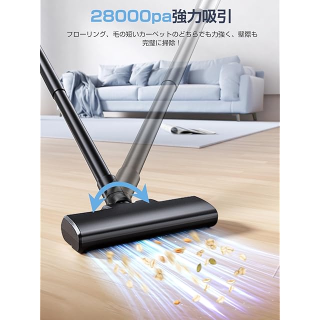 【最大40分連続稼働】コードレス掃除機は7500mAhの大容量バッテリーが内蔵され、エコモードで最大40分連続稼働。吸引力が28KPaまでに達し、パワフルな吸引力を生み出し、ゴミ取り能力がアップ!