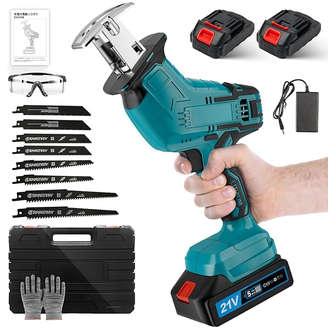 XGAGHBレシプロソー 電動 ノコギリ【2000mAh*2個バッテリー付き&替刃8本】無段変速 21V 充電式ノコギリ セーバーソー 小型 枝切り 竹を切る 庭木の剪定 粗大ごみ切断 木材切断 金属切断 収納ケース 付き 日本語取扱説明書付き 青い