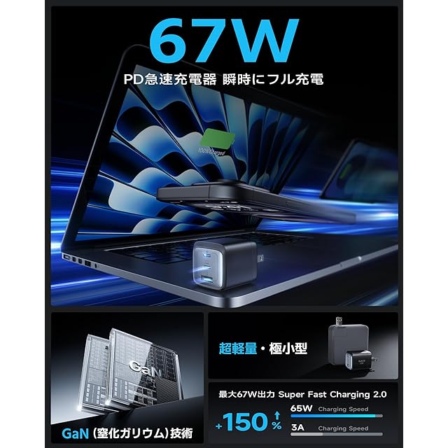 商品名:67W 充電器 type-c usb 【安全で超低温 火花なし 世界最小クラス】 折り畳み式 88g超軽量 急速充電器 GaNIII技術 pd 充 電器 iphone 3ポート 三台同時充 電 タイプc 充 電器 PSE認証済み スマホ 出張·旅行PD3.0/QC3.0/PPS/SCP規格/MacBook/タブレットPC用/ノートpc/iPad/iPhone17などに対応