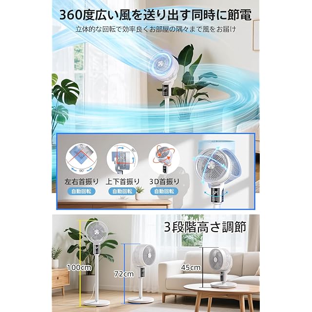 【8段階風量&3D首振りで快適気流】微風から強風まで8段階を調節できます。一番風力が強いモードに設定すると、広いリビングでも問題なく空気循環でき、部屋干し中の洗濯物に風を当てたり、仕切りを挟んで隣接する部屋にも空気を運んだりできます。部屋中の空気をしっかりと循環させたり、部屋干しの洗濯物に風を当てたりとさまざまなシーンで使う場合は、3D首振り機能を備えた、上下の首振り機能は、部屋の上部に溜まりやすい温かい空気と、下部に溜まりやすい冷たい空気を撹拌させ、室温を均一に保つ役割を持ちます.