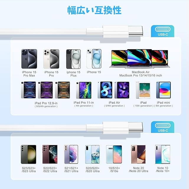 【幅広い互換性】:多くのUSB-C機器に対応し、Android等のスマートフォン、iPad Pro等のタブレット端末にご利用いただけます。for iPhone17/Air/17Pro/17Pro Max/16/15 / Phone15 Plus / Phone 15 Pro / Phone 15 Pro Max, for Galaxy S23 ultra/S22/S21, for Pad Pro 2020/2022, Pad Air 5/4, Pad mini 6, など様々なUSB type cデバイスに対応できます。注意:iphone 14/iPhone 14 Plus/iphone 14 Proおよびそれ以下のモデルはケーブルに互換性がありませんので、慎重に購入してください。