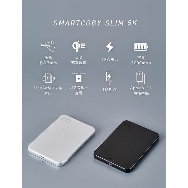 【発熱抑制優先モデル】 本製品は、お客様から寄せられた「発熱をできるだけ抑えて使いたい」という声にお応えし、本体温度の安定性を優先した「SMARTCOBY SLIM 5K セーフティモデル」※です。Qi2規格、最大15W出力でスピード感のある充電をお求めの方には、別ページにて2025年3月より販売しております「SMARTCOBY SLIM 5K」改め「SMARTCOBY SLIM 5Kハイパフォーマンスモデル」をおすすめいたします。 ※セーフティモデルは、Qi2規格最大15W出力やサイズ、重量などハードスペックはハイパフォーマンスモデルと同一です。出力と発熱を制御するプログラムのみ変更しております。そのため、製品パッケージ並びに取扱説明書は共通で「SMARTCOBY SLIM 5K」となっております。