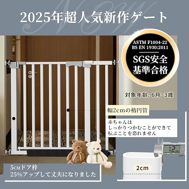 コブキBUJIの進化型で多機能で使いやすい、ベビーゲート、ペットゲート、安全ゲートです。 階段転落防止&ペット侵入ブロックに。 赤ちゃんを守り、犬猫の脱走防止に特化した次世代ゲート。 強化フレーム+広域調整で日本住宅に最適化。 玄関/階段/キッチンに最適。 スチールゲート(ホワイト) + 拡張フレーム + つまずき防止「段差ス口ープ」+ 拡張フレーム補強溝 + 固定金具付属でコスパ抜群! 【取付けも簡単】 ・構造式非磁気自動閉扉で静音&スムーズ開閉。 ・密格子設計(隙間5.5cm)で小型ペットもブロック。 ・解放機能付き 90度以上開くと扉が止まり解放することができます。 ・オートクローズ 90度未満での扉の使用時は、自動で扉が閉まりロックします。 ・片手でオープン 片手で簡単にロックを解除し、扉を開けることができます。 ・前後両開き 扉は前後どちらにも開きます。 ・ダブルロック 上下2ヶ所にロックがかかります。拡張フレームをつけると、153cmまで取り付けが可能です。 ※お客様組み立て商品です、日本語説明書付き。 ※取付け幅 本体: 76~83cm 拡張1本: 69~153cm