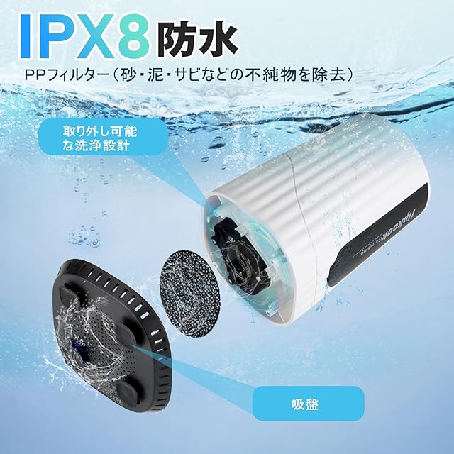 【高い防水性&しっかり】ポンプ付きシャワー ポンプ 電動はIPX8等級の防水性で、全身を水中に入れることができ、充電口には防水キャップが付き、安全に使用できます。つまり、ビーチ、湖、雨の中など濡れた環境でも安全に使用できます。キャンピングシャワーポンプの底にある吸盤デザインにより、シャワーポンプがバケツの底にしっかりと固定され、転倒を防ぎます