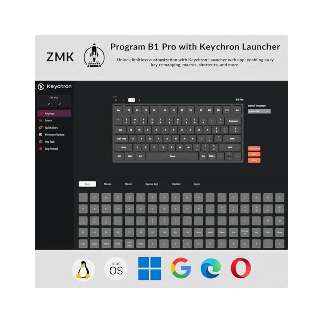 ウェブアプリで任意のキーをプログラム - MacOS、Windows、Linuxを問わず、Keychron Launcherウェブアプリ(ダウンロード不要)または最新のChrome、Edge、Operaブラウザ上のZMKファームウェアで任意のキーとマクロをリマップできます。