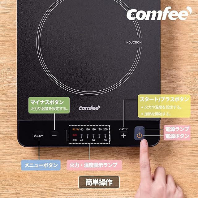 COMFEE' クッキングヒーター IH式 薄型 1000ワット 3種メニュー 揚げ物 3段保温 炒め料理 CIC-10GKBLA1