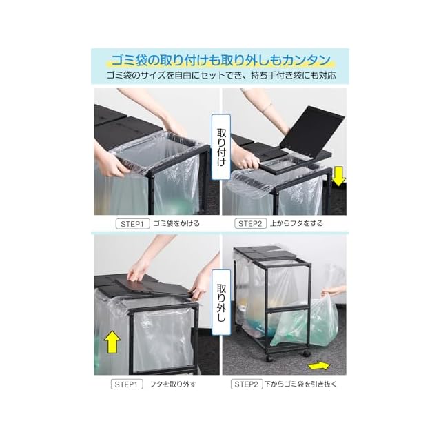 【確認しやすい・漏れにくい】袋の中身が見え、どれだけゴミが溜まったか確認しやすい。袋状のものや袋状になるものならほとんどのものがゴミ袋として使えます。フタをすることでニオイを抑えられ、腐敗臭に虫が寄ることも防止できて衛生的です。フタは片手でも簡単に開閉可能。開口部が広いので大きなゴミ捨ても簡単です。大きなゴミ袋をかければ45L用のゴミ袋スタンドになります。