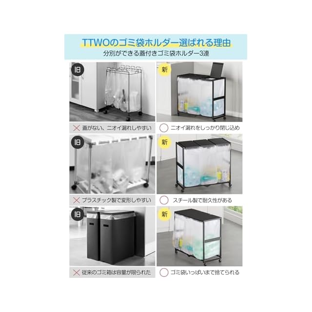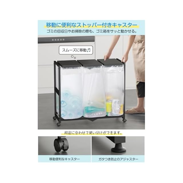 商品名:TTWO ゴミ箱 3分別 ダストワゴン ゴミ袋ホルダー 高さ三段調節20~45L袋対応 約W70xD32.5xH65cmふた付き におい遮断 キッチン ゴミ袋スタンド 大容量 ダストボックス 使いやすい・清掃容易 シンプルフレーム構造 レジ袋 ポリ袋 エコサイクルスタンド スリム おしゃれ キャスター/アジャスター両方付き (ブラック)