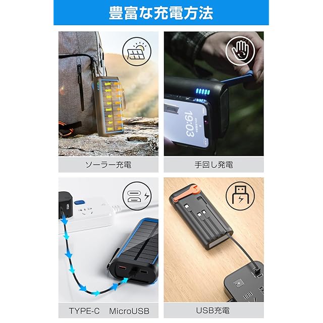 【5way蓄電&IPX7防水機能&防塵&&耐衝撃】ソーラーパネルで、太陽光で蓄電できる上に、入力用microUSBと入出力兼用type-Cポートを一つずつ備え、USB電源から本体への蓄電が可能です。内蔵USBケーブルを加えて、ケーブルを持ち忘れたときもバッテリー本体へ蓄電ができ、さらに、手回しでバッテリー本体へ蓄電もでき、合わせて、5way蓄電が可能です。PX7防水・防塵機能が備えられていて、そしてUSBポート部分には厚いカバーが付くので、強い風が吹いて砂埃が舞ったり、急に雨が降ってきたりどんな天候でも耐えられます。ABS+PC材質を採用し、四角は硬いゴムでカバーされ、全体的に頑丈でゴツイ作りになっていて、落下による衝撃に耐えることができます。(ご注意:ソーラー充電では、満タンになるまで時間がかかるため、普段なら、USBケーブルで充電することをお勧めします。)