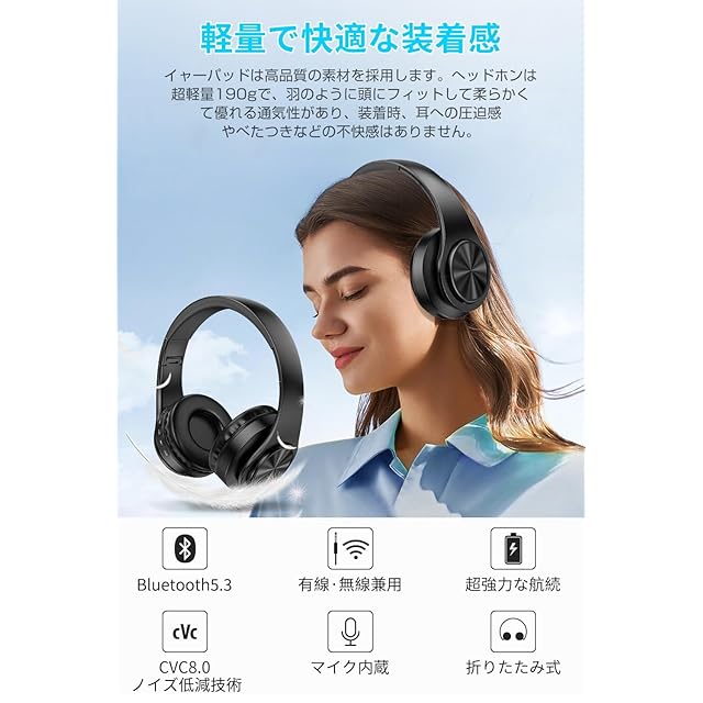 商品名:【Bluetooth5.3搭載】binoa ヘッドホン ワイヤレスヘッドホン Bluetooth 有線 無線 両用 密閉型/軽量 最大38時間連続再生 音漏れ防止 折り畳み可能 音量調整可 CVC8.0ノイズキャンセリング SBC/AAC対応 低遅延 急速充電対応 TELEC認証 男女兼用 テレワーク/通勤/通学/音楽/映画 日本語取説明書