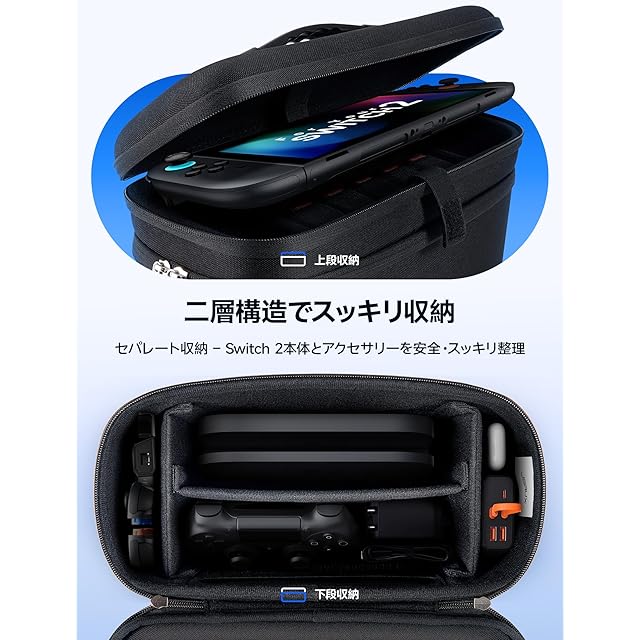 JSAUXのSwitch 2対応キャリングケースは、Switch 2本体(保護カバー付き可)をはじめ、Joy- Con、Proコントローラー、充電ドック、ACアダプター、ケーブル、ゲームカード10枚などをまとめて収納できるオ ールインワンタイプの大容量トラベルバッグです。外装には高密度EVAハードシェルと防水ナイロン素材を採用 しており、衝撃や水濡れから機器をしっかり保護します。内部は柔らかなクッションライニングと2層式仕切り構 造を備え、上段に本体を固定し、下段にはコントローラーやアクセサリーを機能別に整理できます。メッシュポ ケットも付いており、ケーブルや小物の収納に便利です。さらにTPU製ハンドルと調節可能なショルダーベルト により、旅行や通勤、ゲームイベントへの持ち運びも快適で、自宅での整理用としても活躍します。シンプル で洗練されたデザインは誕生日やクリスマスなどのギフトにもぴったりで、実用性とスタイルを兼ね備えたアイテ ムです。本製品にSwitch 2本体および周辺機器は含まれておりません。