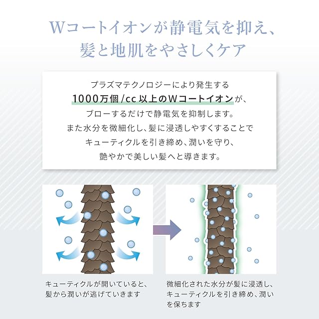 ✅プラズマケア:1000万個/cc以上のWコートイオンが髪の潤いを守り、静電気を抑制します。