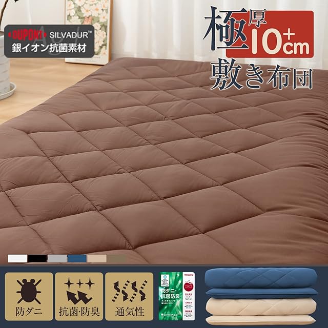 商品名:敷き布団 極厚10cm 五層構造 シングル 【TEIJIN マイティトップ中綿使用】抗菌・防臭・防カビ・防ダニ・吸汗・速乾 しきふとん ウレタン入り 高級 折り目なし 敷布団 しっかり支える 三つ折り 体圧分散 ホコリが出にくい ピーチスキン加工 やわらかな肌触り [圧縮なしタイプ 極厚] 100×210cm,ブラウン