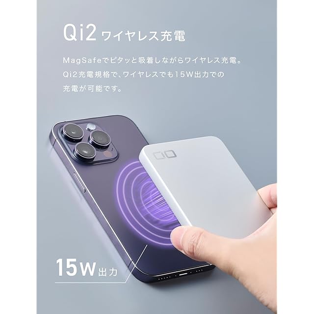 【ワイヤレス充電時の対応機種、発熱について】※15Wの出力でのマグネット式ワイヤレス充電は、iOS 17.4をインストールしたiPhone 12以降のモデルにのみ可能です。iPhone 11以前のモデル並びにSEシリーズ、16eへワイヤレス充電する場合、Max出力は7.5Wになります。また、Androidスマホへワイヤレス充電する場合、Max出力は機種によって変わりますので、Qi2充電時の出力スペックをご確認ください。※Max15Wは、最大充電パフォーマンスのため、iPhoneの充電状況や周囲の環境温度によって充電速度は変化します。したがって、iPhoneで動画視聴中やゲームをしながらの充電、周囲が25℃以上の環境温度の場合、特に充電速度が著しく低下することがございます。充電速度を優先する場合は、なるべく涼しい環境や、スマートフォン操作と同時に使用することをお控えください。
