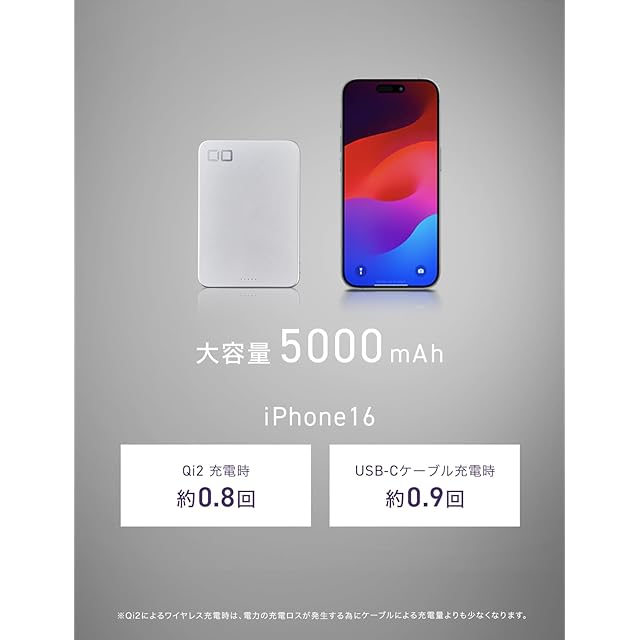 【容量と充電ロスについて】※本製品の公称容量は 5000mAh (3.85V, 19.25Wh) です。しかし、モバイルバッテリーは他の端末に充電する際にエネルギーロスが発生するため、実質容量は 3000mAh(5V/2A) となり、公称容量の約 60% となります。また、ワイヤレス充電時には電磁誘導の過程でエネルギーロスが発生します。ワイヤレス充電を利用する際は、実質的な充電量が低下することをご了承ください。急速充電(PD 9Vなど)を利用する場合、変換効率の影響で放電容量が低下することがあります。本製品のバッテリーエネルギー量は 19.25Wh ですが、9Vで放電する場合、実質容量は約2139mAh となります。