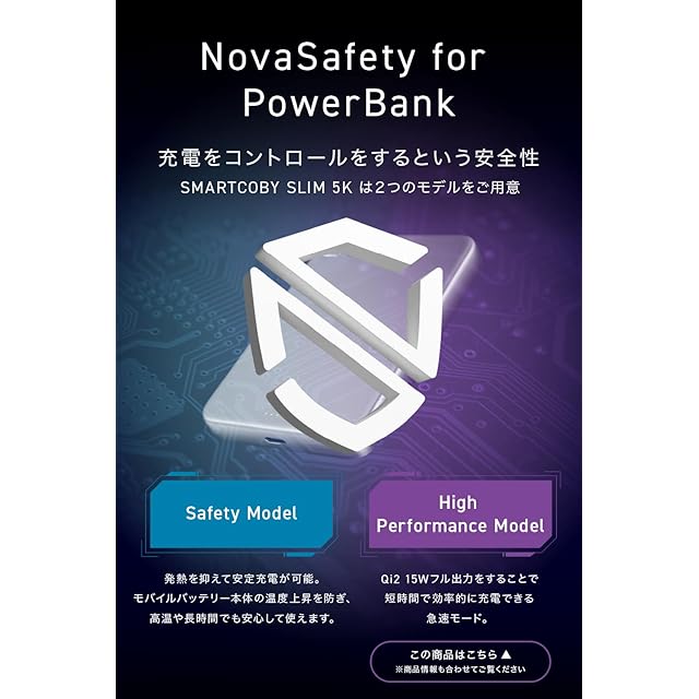 【High Performance Model(速度重視)とは】 本製品のHigh Performance Modelは、充電速度を優先した出力制御により対応端末では短時間での充電体験を目指す設計です。その性質上、Safety Modelに比べ発熱は高まりやすく、周囲温度が高い場合やケース装着・連続使用時などは端末または本体の保護機能により自動で出力が抑制されたり一時停止となることがあります。 【発熱抑制優先モデル】 本製品は、お客様から寄せられた「発熱をできるだけ抑えて使いたい」という声にお応えし、本体温度の安定性を優先した「SMARTCOBY SLIM 5K セーフティモデル」※です。※セーフティモデルは、Qi2規格最大15W出力やサイズ、重量などハードスペックはハイパフォーマンスモデルと同一です。出力と発熱を制御するプログラムのみ変更しております。そのため、製品パッケージ並びに取扱説明書は共通で「SMARTCOBY SLIM 5K」となっております。 季節問わず日中の長時間充電や高温環境での連続運用を重視される場合はSafety Modelのご利用を推奨します。※ご使用環境・端末個体差により充電時間や温度の結果は変動します。