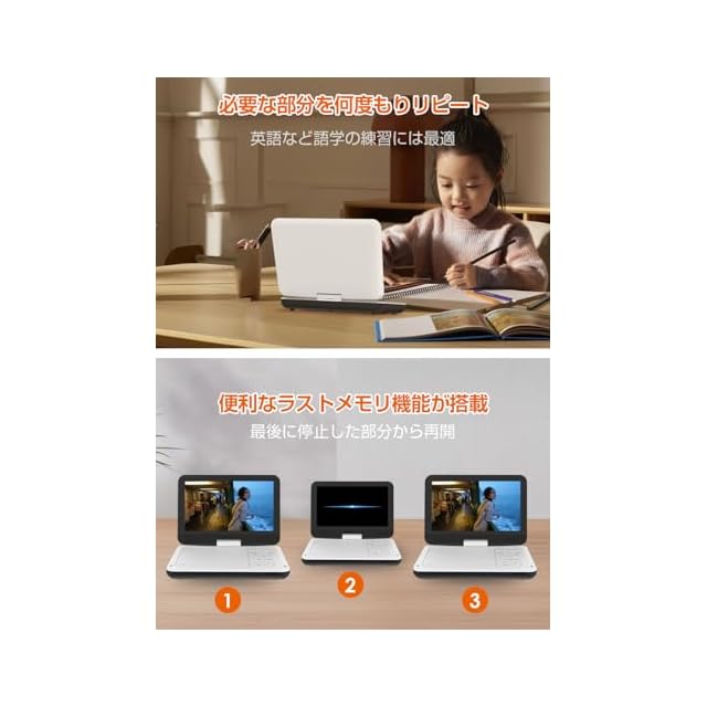 嬉しい機能が満載 子供からお年寄りまでご愛用USBメモリやSDカード対応端子あり、保存された画像・映像・音楽が再生できる。ワンボタンで必要な部分を何度もりリピート、英語など語学の練習には最適。DVDの視聴中に充電が切れても、停止したところを記憶するレジューム機能も搭載。ボリューム、停止、消音等直ぐに使いたい操作は一目で分かるボタンがあり、それを押すだけ、お好きに映画/写真を鑑賞する。子供は学習ビデオやアニメを存分に楽しみ、お年寄りも簡単に使える。