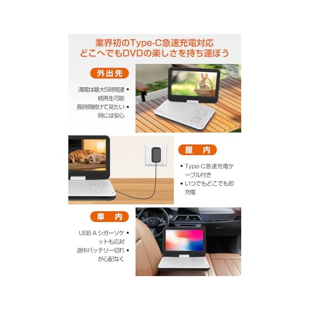 ポータブルDVDプレーヤー【業界初 type-c急速充電 目の保護モード】12.5型 10.5インチ液晶 cd dvdプレーヤー ポータブル 最大5時間連続再生 リージョンフリー CPRM対応 レジューム機能 270度回転 TV同期可能 SDカード/USBに対応 軽量 持運び 操作簡単 日本語説明書 VOSCORDER