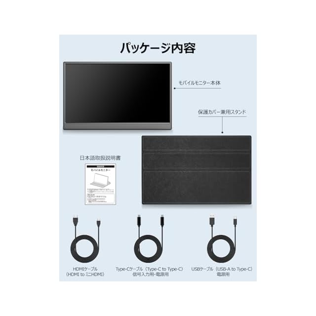 【パッケージ内容 安心なサポート】パッケージ内容は、モバイルモニター本体、HDMIケーブル(HDMI to ミニHDMI)、信号入力用・電源用Type-Cケーブル(Type-C to Type-C)、電源用USBケーブル(USB-A to Type-C)、保護カバー兼用スタンド、日本語取扱説明書です。返品・返金は30日、商品は1年。商品に関してもし何か不具合やご不明な所がございましたら、いつでもお気軽にお問い合わせくださいませ。