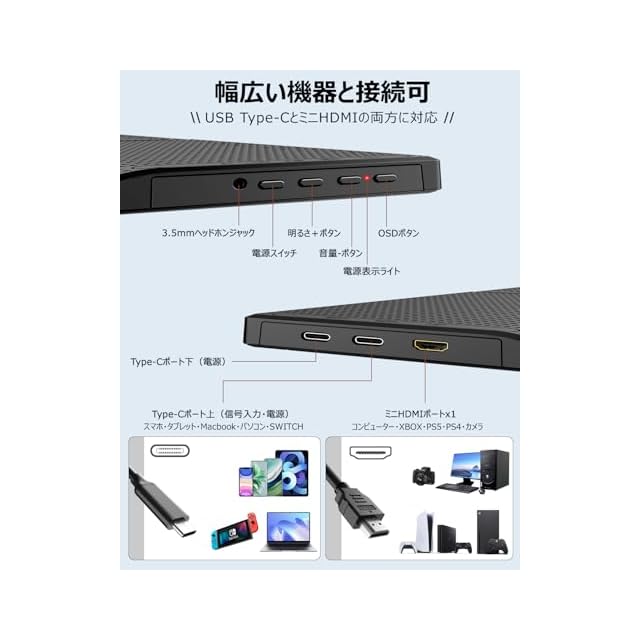 【ご注意】すべてのType-Cポート搭載デバイスがこのモバイルモニターと接続することで映像出力をサポートしているわけではありません。デバイスのType-Cポートの規格によっては、映像出力に対応していない場合があります。ぜひご注意ください。商品説明に信号入力も電源もType-Cケーブル1本で済む機能をサポートできるデバイスリストを掲載しましましたが、スペースの制限ですべてのデバイスが表示されるわけではありません。手元のデバイスをサポートするのかご確認したい場合に、下記のお問い合わせ先にご連絡ください。送信する際にデバイスのブランドと型番をお教えください。①「注文履歴」→該当注文の「注文に関する問題」を選択→「出品者に問い合わせる」②商品ページで在庫状況に表示される出品者名を選択→「○○○(出品者名)ご質問がありますか?」の下に表示される「質問する」を選択