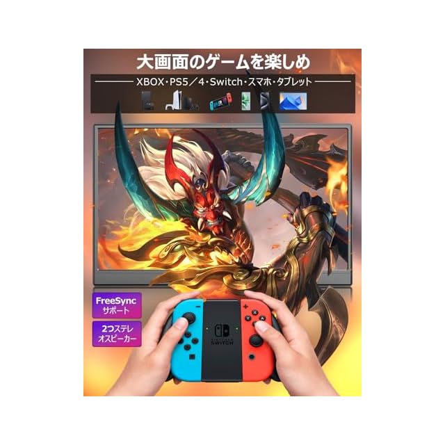 【USB Type-CとミニHDMIの両方に対応 ケーブル1本簡単接続】モニターにUSB Type-Cポートを2つとミニHDMIポートを1つ装備、PC、スマートフォン、タブレット、Switchといったゲーム機など様々な機器を接続して使用することができます。USB Type-Cポートが映像や音声などのデータを伝送するだけでなく、モバイルディスプレイの給電もできるので、信号入力も電源もType-Cケーブル1本で済む、机上をスッキリさせます。さらに、二つのステレオスピーカーを搭載し、ゲームや映画鑑賞などで使用するのにも重宝します。「FreeSync」機能搭載され、描画の遅延やカクツキを軽減、映画やゲームはよりスムーズに表現します。※ご注意:①上のType-C ポートだけが信号入力も電源供給も可、下のType-C ポートが電源供給のみサポートする。②給電不足やミニHDMI使用の場合には、下のType-Cポートから5V2Aの外部電源を接続してください。電源アダプターは付属されません。