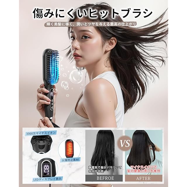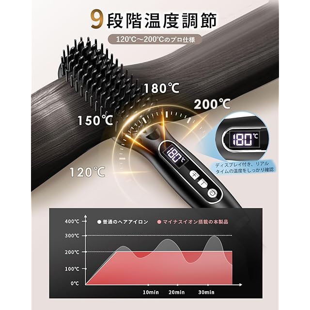 ヒートブラシ ブラシアイロン【120~200℃ 9段階温度調整 MAX200℃ 3000万マイナスイオン 潤いとつやのある髪 ヘアケア アイロンブラシ 60分自動オフ LEDディスプレイ】 ヘアアイロン 軽量 コンパクト 持ち運び便利 電熱ヘアブラシ 火傷防止 ストレートブラシ