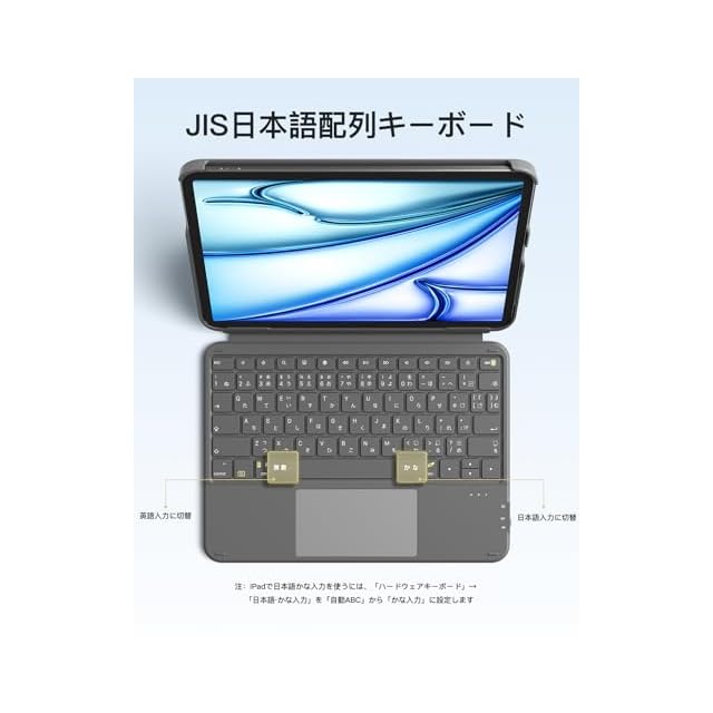 入力設定:シザースイッチ構造に1mm短キーストロークを採用し、打鍵フィーリングが軽快です。1時間連続でタイピングしても手首が疲れにくい仕様。Bluetoothキーボードを接続した後、かな入力法を使用する際のタイピング体験を向上させるために、ハードウェアキーボードの設定を調整してください。「日本語ーかな入力」を選択し、「自動ーABC」オプションを 「かな入力」に変更してください