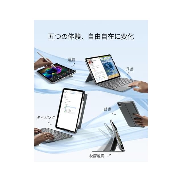 1秒磁石脱着:ipad キーボード付きケースは磁石接続で1秒で簡単に着脱可能。仕事ではキーボードを装着すると「ノートPC」のように変身し、キーボードと画面の角度がよりフィットします;昼休みの動画視聴や会議でのプレゼン時は瞬時に薄型ケースに変身。背面スタンドは横置きでの動画鑑賞から縦置きでの文書閲覧まで、1つのアクセサリーですべてのシーンに対応