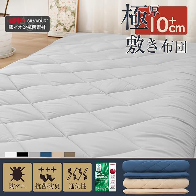 商品名:敷き布団 極厚10cm 五層構造 シングル 【TEIJIN マイティトップ中綿使用】抗菌・防臭・防カビ・防ダニ・吸汗・速乾 しきふとん ウレタン入り 高級 折り目なし 敷布団 しっかり支える 三つ折り 体圧分散 ホコリが出にくい ピーチスキン加工 やわらかな肌触り [圧縮なしタイプ 極厚] 100×210cm,グレー