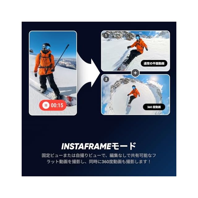 InstaFrameモード:即シェアできるフラット動画を瞬時に入れよう。オートフレーミングを選んでカメラに追尾させるか、固定アングルに固定しよう。360度動画を後でプレビューして、予期せぬ瞬間も追加しよう。