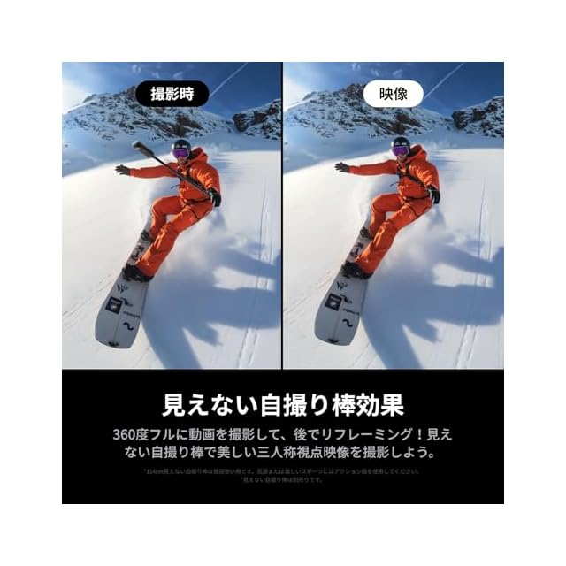 見えない自撮り棒:自撮り棒が映像から消えるので、不可能とも思える三人称視点での撮影ができます!すべてを360度で撮影し、後からAIアシストリフレーミングを使ってアングルを選べます。