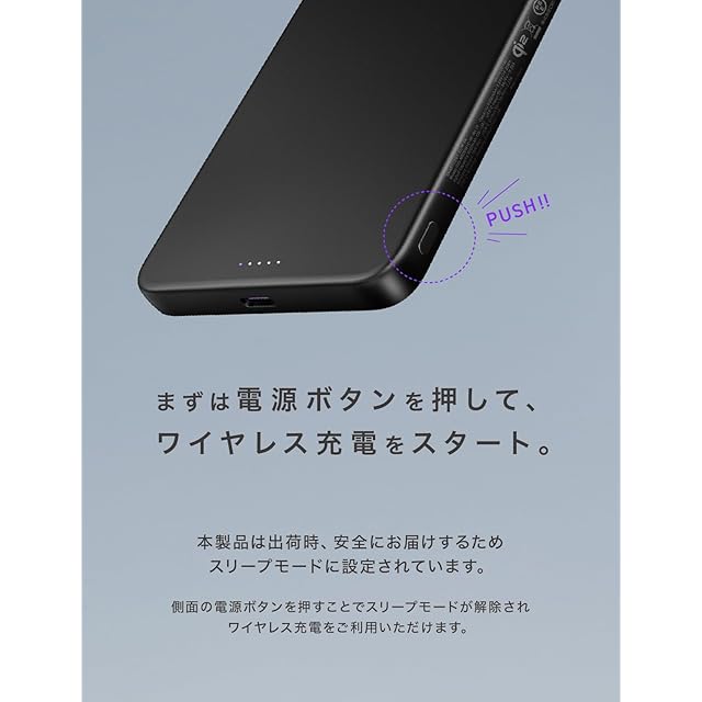 【容量と充電ロスについて】※本製品の公称容量は 5000mAh (3.85V, 19.25Wh) です。しかし、モバイルバッテリーは他の端末に充電する際にエネルギーロスが発生するため、実質容量は 3000mAh(5V/2A) となり、公称容量の約 60% となります。また、ワイヤレス充電時には電磁誘導の過程でエネルギーロスが発生します。ワイヤレス充電を利用する際は、実質的な充電量が低下することをご了承ください。急速充電(PD 9Vなど)を利用する場合、変換効率の影響で放電容量が低下することがあります。本製品のバッテリーエネルギー量は 19.25Wh ですが、9Vで放電する場合、実質容量は約2139mAh となります。