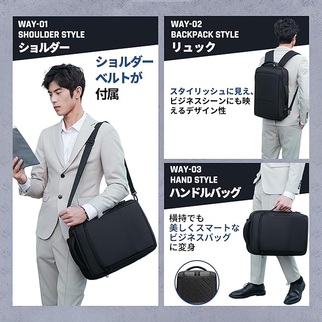 ✅【変身型3WAY ビジネスバッグ】:3WAY:ビジネスリュック・ショルダーバッグ、手提げバッグ、 3つのタイプ、さらにショルダーベルトが付属。ショルダーストラップを裏側に収納すると、横持でも美しくスマートなビジネスバッグに変身!正面と側面にはバッグハンドルが付いてますので、シーンに合わせてお好みの持ち方を選択できます。ビジネスや通勤、出張などに活躍します!